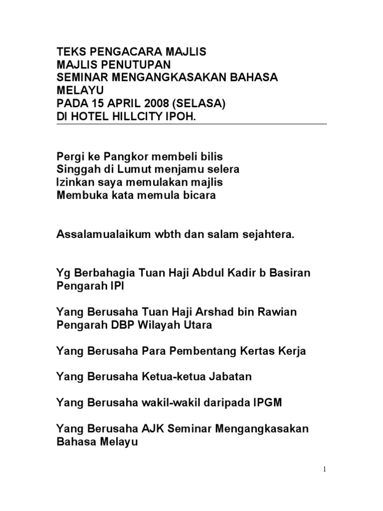Assalamualaikum mulanya kata Saya sembah pembuka bicara. Teks pengacara majlis makan malam tidak formal teks pengacara majlis formal please fill this form we will try to respond as soon as possible. Demikianlah tadi ucapan perasmian yang telah disempurnakan oleh Yang berbahagia Tuan Pengarah Kolej Vokasional Juasseh Puan Nor Asikin Binti Md Shazilli.